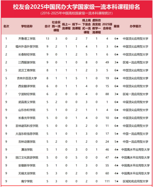 近日,全国第三方大学评价机构艾瑞深校友会网(cuaa.net)正式发布《校友会2025中国大学国家级一流本科课程排名》。本次排名基于2016-2025年中国大学(第一建设单位)被认定的国家级一流本科课程。西安翻译学院凭借6门国家级一流本科课程的总量,在全国排名中表现突出,国家级一流本科课程数量位列全国民办高校前四,陕西民办高校第一。