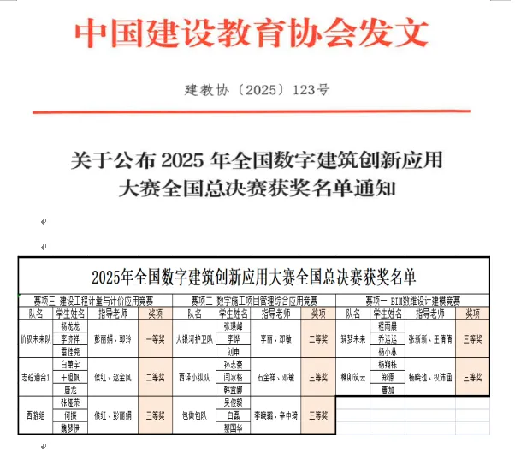 近日,2025年全国数字建筑创新应用大赛落下帷幕。我校学子摘得国家级一等奖1项、二等奖2项、三等奖5项,其中一等奖团队跻身全国12强,不仅刷新了我校在该赛事的历史成绩,更实现了获奖数量与质量的双重突破,标志着学校在数字建筑领域的教学与实践水平迈上新台阶。