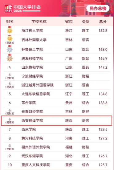 2026年4月15日,高等教育专业评价机构软科正式发布“2026软科中国大学排名”。西安翻译学院以强劲实力再次刷新历史——位列全国民办高校总榜第六名,较2025年(第9名)再升3位;在中国民办语言类高校排名中继续保持全国前三;同时问鼎陕西民办高校第一名,充分彰显了学校高质量发展的卓越成效与强劲实力。